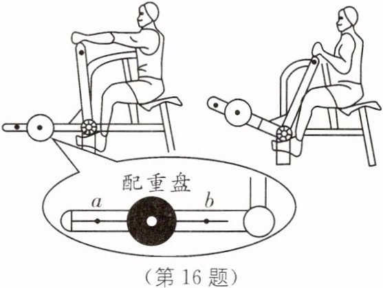 16.变小 a [解析]人用始终与把手垂直的力缓慢向后将把手拉至身体两侧,动力臂不变,阻力大小等于物体的重力,即阻力不变,由图可知转动过程中阻力臂会变小,根据杠杆的平衡条件知,拉力会变小;若要增加训练强度,应将配重盘向a端移动,增大阻力臂。