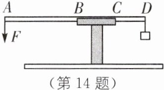 14. 如图所示,轻质杠杆AD放在钢制水平凹槽BC中,杠杆AD能以B点或C点为支点在竖直平面内转动.$AB= 2BC= 2CD= 0.6\ \text{m}$,D端挂有一重物,现在A点施加一个竖直向下的力F,使得杠杆保持水平平衡.