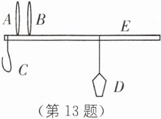 13. (2024·无锡南长实验中学月考)如图所示,杆秤是一种测量质量的传统工具,其中A、B是两个不同量程的提纽,秤钩C处悬挂被测物,提起提纽A或B,在秤杆E上移动秤砣D,达到平衡后,根据秤砣的位置可以在秤杆上读出被测物的质量.有关该杆秤下列判断中正确的是(
