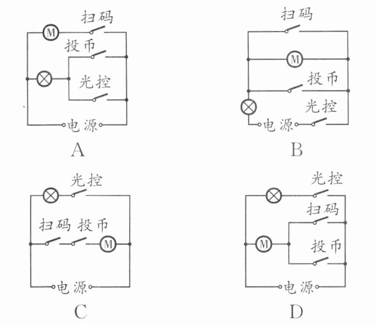 ).[A选项电路图:电源,M与扫码、投币并联后的开关串联,指示灯与光控开关串联后并联在电源两端]
