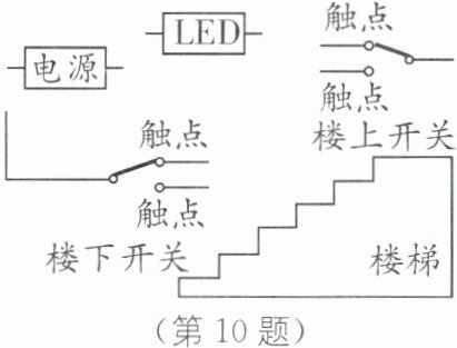 10.(2024·南京六合区月考)小明用一个电源、两个单刀双掷开关、一个LED灯和若干导线,设计一个楼梯灯电路,无论是楼上或楼下都可以任意开灯、关灯,请你根据小明设计的意图,用笔画线代替导线完成如图所示的电路.
