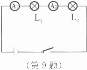 9.在物理课上,小刚和同学们正在做“探究串联电路中各点的电流有什么关系”的实验,当如图所示的电路接通后,小刚发现电流表$A_1$的读数比电流表$A_2$的读数要大一些,于是他猜想:当电流通过灯泡(用电器)时,灯泡发光,是因为灯泡消耗了电能,所以电流在流动过程中将逐渐变小,于是电流表$A_1$的读数比电流表$A_2$的读数大一些.小刚同学的猜想是