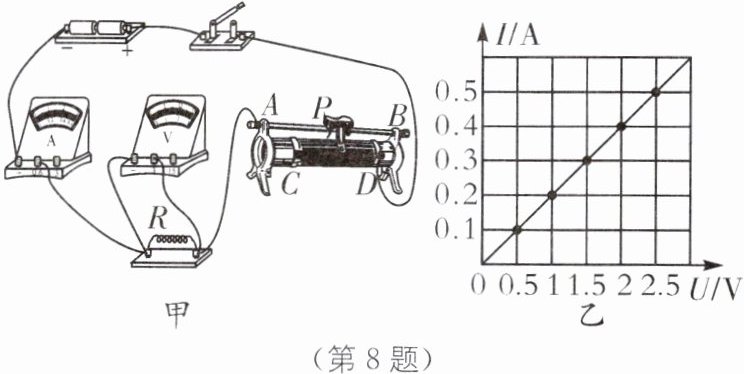 8. 小明同学利用如图甲所示的电路探究“电流与电压的关系”.已知电源电压是3V,其中滑动变阻器有$R_{1}$(20Ω 2A)、$R_{2}$(30Ω 1A)两种规格可选.