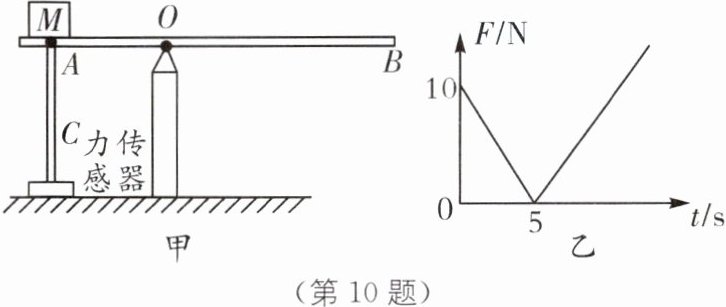 10. 如图甲所示,AB为轻质杠杆,AC为轻质硬棒且与力传感器相连,如图乙所示是物体M从A点开始向右匀速运动过程中力传感器读数大小与时间的关系图像,则物体M的质量为______g;已知OA的长度为30cm,OB足够长,AC能承受的最大弹力大小为15N,若要杆不断,物体从A点开始运动时间最长为______s.(g取10N/kg)