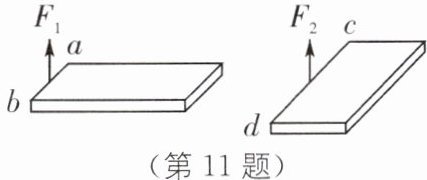 11. 如图所示,质量均匀且相同的两块砖平放在水平地面上,现用竖直向上的力$F_{1}$、$F_{2}$分别作用在ab、cd的中点,使它们缓慢地竖立起来,且砖不在地面上滑动.当砖的边ab、cd刚离开地面时,$F_{1}$______(填“>”“<”或“=”)$F_{2}$;在ab边不断抬高的过程中,$F_{1}$的大小将______(填“变大”“变小”或“不变”).