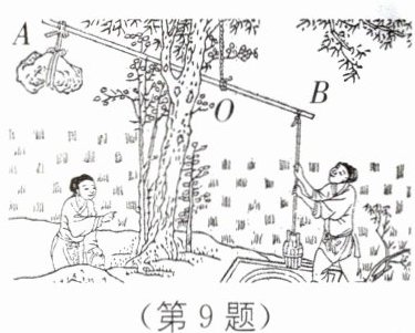 9. 传统文化 桔槔中的杠杆问题 (2024·广安中考)桔槔是《天工开物》中记载的一种原始的汲水工具,在拗石辅助下,人几乎可以不用力就能将一桶水从井中提起.如图所示,已知A点所挂拗石重力为100N,$OA:OB= 2:1$,两侧悬挂的绳子始终保持在竖直方向,忽略横杆和绳的重力($\rho_{水}= 1.0× 10^{3}\ \text{kg/m}^{3}$).下列说法错误的是(