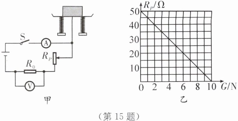 15. (2024·成都中考)小孟在实验室设计了一款测量物体重力的装置,其示意图如图甲所示,物体放在有弹簧支撑的托盘上,弹簧底部固定,该装置可以通过电表示数转换测出重力大小. 图乙是滑动变阻器接入电路中的阻值 RP 与被测物体重力 G 的关系图像. 电源电压恒为 24 V,定值电阻 R0 为 30 Ω,电流表量程为 0~0.6 A,电压表量程为 0~15 V,滑动变阻器标有"50 Ω 1 A".