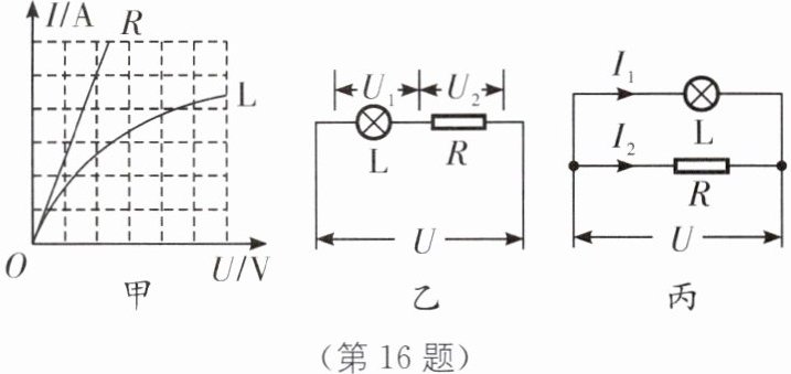 16. (2023·凉山州中考)如图所示,图甲是灯泡 L 和定值电阻 R 的 I-U 图像,将 L 和 R 先后以图乙、丙两种方式连在同一电源上,若图乙中 U1:U2= a,图丙中 I1:I2= b,则下列选项中错误的是(