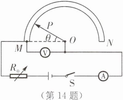 14. 新情境 设计制作电子量角器 (2024·宿迁中考)新房装修时,工人经常用普通量角器测量一些角度,不方便读数. 小明根据所学的知识设计了电子量角器,电路如图所示,电流表的量程为 0~0.6 A,电压表的量程为 0~3 V,O 为半圆弧电阻 MN 的圆心,金属滑片 OP 为半径,与半圆弧接触良好,接入电路的电阻 RMP 与指针旋转角度 θ 成正比,电源电压恒为 6 V,R0 为电阻箱. 将滑片 OP 旋转至 M 处,调节 R0 的阻值,使电路中电流为 0.6 A.