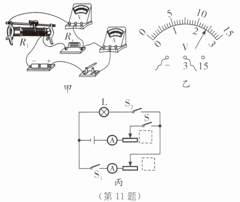 11.(2024·南京鼓楼区期末)测量电阻的实验中,电源电压约3 V且不变,滑动变阻器$R_{1}$的规格为“10 Ω 1 A”,待测电阻$R_{x}$的阻值约几欧,小灯泡L的额定电流为0.3 A.
