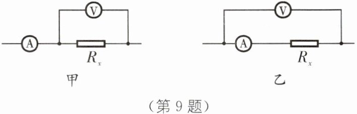 9. 通常,我们认为:电流表的内阻为零,电压表的内阻为无限大.实际上,电流表和电压表都有一定的电阻值,因而我们可以把电流表看成一个能显示通过自身电流大小的阻值很小的电阻;可以把电压表看成一个能显示自身两端电压大小的阻值很大的电阻.这样,把电流表或电压表与被测电阻$R_{x}$连接时,就相当于$R_{x}$串联或并联了一个电阻.此时,电流表的两端就会有电压,电压表中就要通过电流,因此,实际上很难同时精确地测出$R_{x}两端的电压和通过R_{x}$的电流.