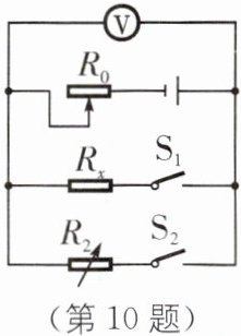 (3)$R_{2}$ [解析]只闭合开关$S_{1}$时,$R_{0}$、$R_{x}$串联,电压表测量$R_{x}$两端的电压,适当调节滑动变阻器$R_{0}$,读出电压表示数,测量出$R_{x}$两端的电压,记为$U_{1}$;断开开关$S_{1}$,闭合开关$S_{2}$,$R_{0}$与电阻箱串联,电压表测量电阻箱两端的电压,保持滑动变阻器$R_{0}$的阻值不变,调节电阻箱的阻值,使电压表示数达到$U_{1}$。$R_{x}$、$R_{2}$分别与$R_{0}$串联在同一电路中,由于电压表示数相等,根据分压原理可知,两电阻串联在电路中,电阻两端电压与其阻值成正比,所以$R_{x}=R_{2}$。