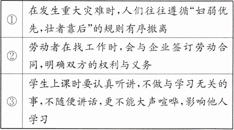 D [解析]本题考查规则的种类。遵循“妇弱优先,壮者靠后”的规则,属于道德的要求;与企业签订劳动合同,明确双方的权利与义务,属于法律的要求;学生上课时要认真听讲,不做与学习无关的事,属于课堂纪律的要求。D对应正确,A、B、C对应错误。