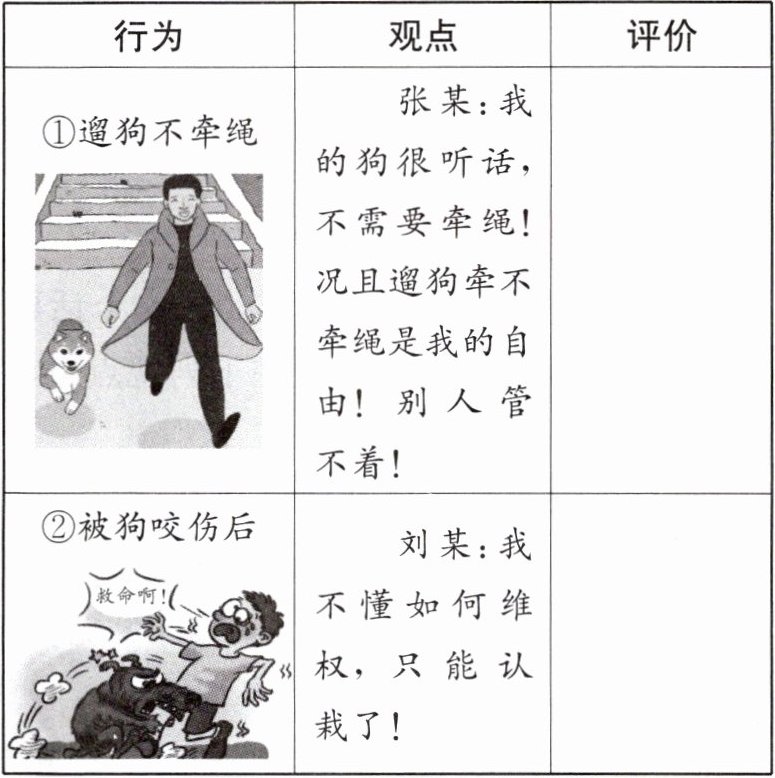 [解析]第(1)问需要对张某和刘某的观点进行正确判断,根据“我的狗很听话,不需要牵绳!”“我不懂如何维权,只能认栽了!”可知两人的观点都错误。理由需要从自觉遵守规则、学会依法办事等角度作答。第(2)问考查完善倡议书,属于开放性试题,言之有理即可。