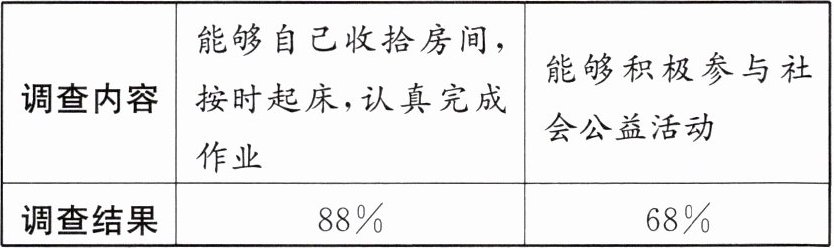 |调查内容|能够自己收拾房间,按时起床,认真完成作业|能够积极参与社会公益活动|