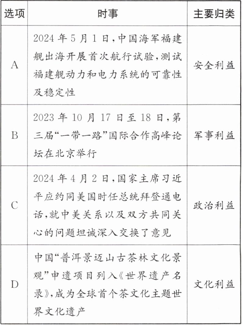 7. 中考新考法 时事解读 (2025·广东汕头潮南区期末)国家利益的内涵十分丰富。以下对时事所涉及的国家利益归类有误的是( )