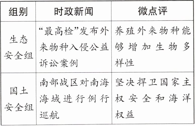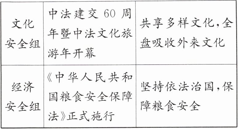 D [解析]“养殖外来物种”会破坏生态平衡、威胁生态安全,生态安全组说法错误;“全盘吸收”说法过于绝对,对于外来文化我们要取其精华、去其糟粕,文化安全组说法错误;“对南海海域进行巡航”,是坚决捍卫国家主权和海洋权益、维护国家安全的表现,国土安全组说法正确;《中华人民共和国粮食安全保障法》正式施行,为保障粮食安全提供法律依据,体现了我国坚持依法治国的基本方略,经济安全组说法正确。D正确,A、B、C错误。