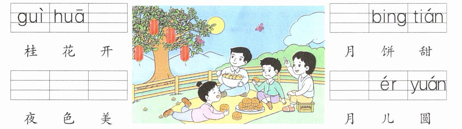 从上到下,从左到右:kāi yè sè měi yuè yuè