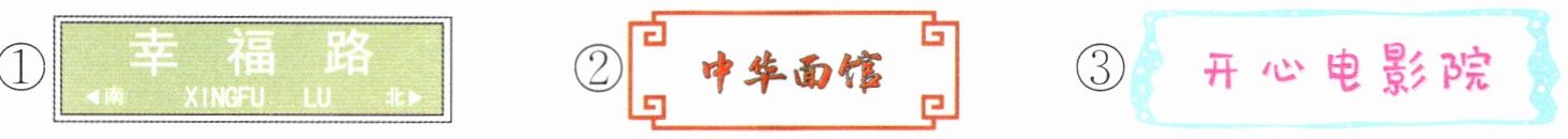 六 下面是一些招牌和路牌,请你认一认,按要求完成练习。