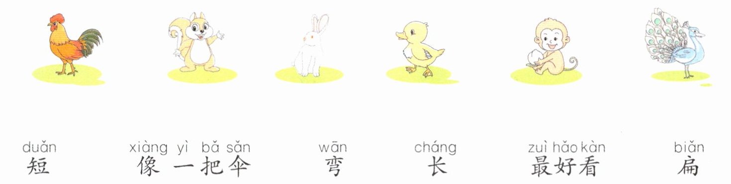 解析:这道题考查对课文的积累。由课文内容可知,猴子的尾巴长,兔子的尾巴短,松鼠的尾巴好像一把伞;公鸡的尾巴弯,鸭子的尾巴扁,孔雀的尾巴最好看。据此连线即可。