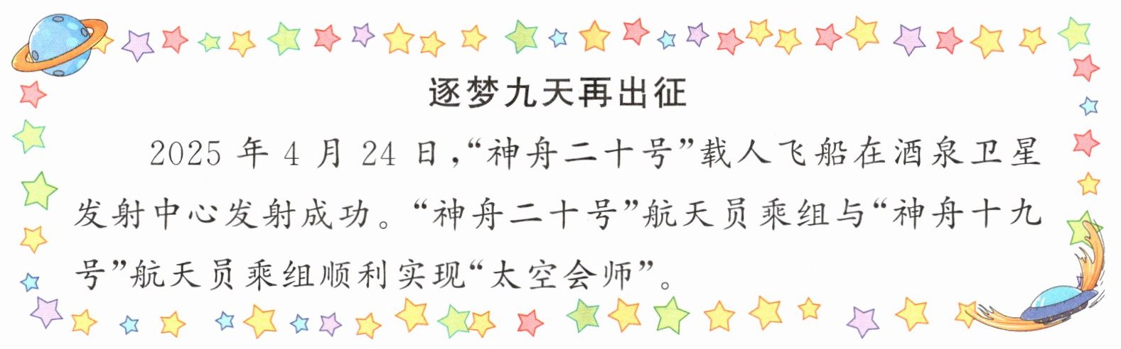 2025年4月24日,“神舟二十号”载人飞船在酒泉卫星发射中心发射成功。“神舟二十号”航天员乘组与“神舟十九号”航天员乘组顺利实现“太空会师”。