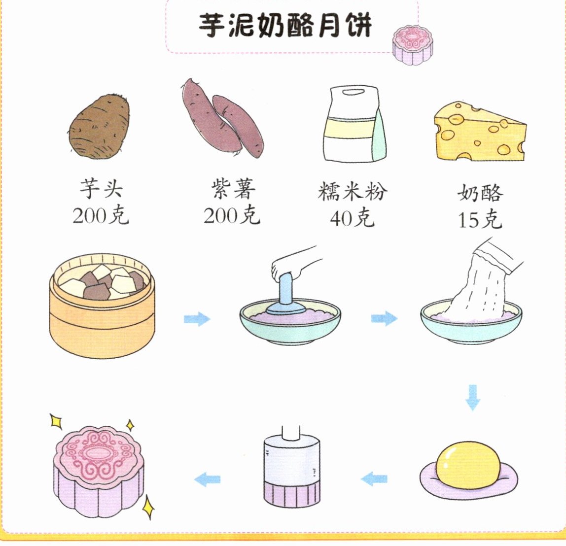 3. 根据图片内容,给芋泥奶酪月饼的制作过程排序。
