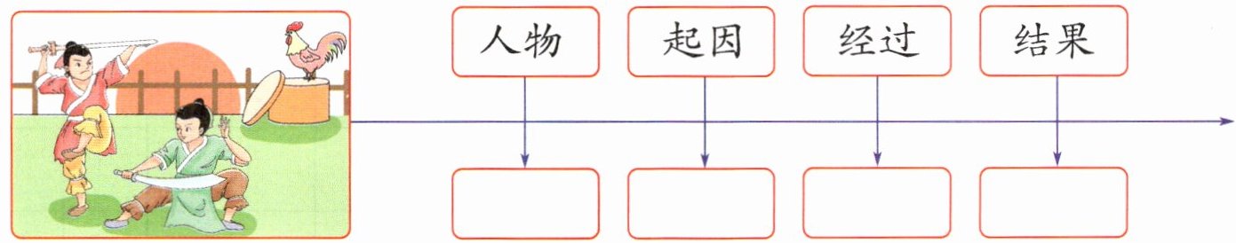 解析:本题考查对故事内容的梳理。闻鸡起舞故事的主人公是祖逖和刘琨。一开始祖逖想为国家效力,于是决心练就过硬的本领,这是故事的起因;祖逖决定和刘琨一起练习武艺,每天只要听到鸡叫,他们就立刻起身练武,这是故事的经过;最后,他们二人的武艺都变得很高强,祖逖当上了将军,保卫了国家。据此完成导图即可。