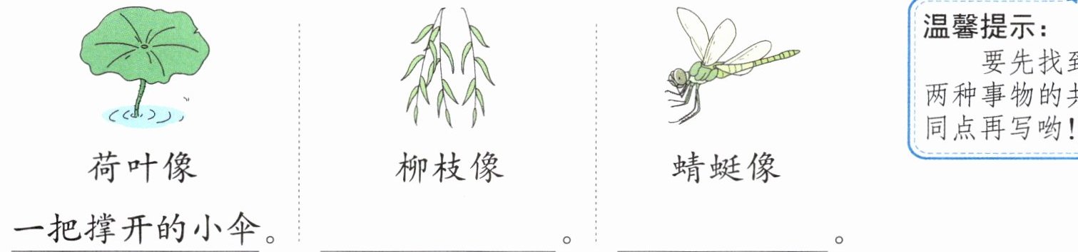 解析:本题考查仿写比喻句。比喻句中的两个事物之间是有相似点的,如例句中荷叶和撑开的小伞都是圆圆的。要写第二幅图中的柳枝和第三幅图中的蜻蜓,需要联系生活,发挥想象,找到与它们有相似点的事物进行仿写。
