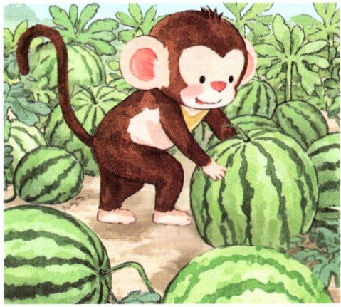 小猴跑到西瓜地里,他第一次见到西瓜,感到很有趣,摘下一个西瓜就要吃。