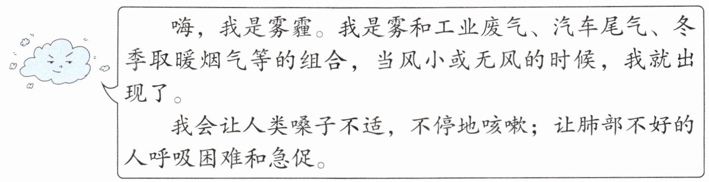 嗨,我是雾霾。我是雾和工业废气、汽车尾气、冬季取暖烟气等的组合,当风小或无风的时候,我就出现了。