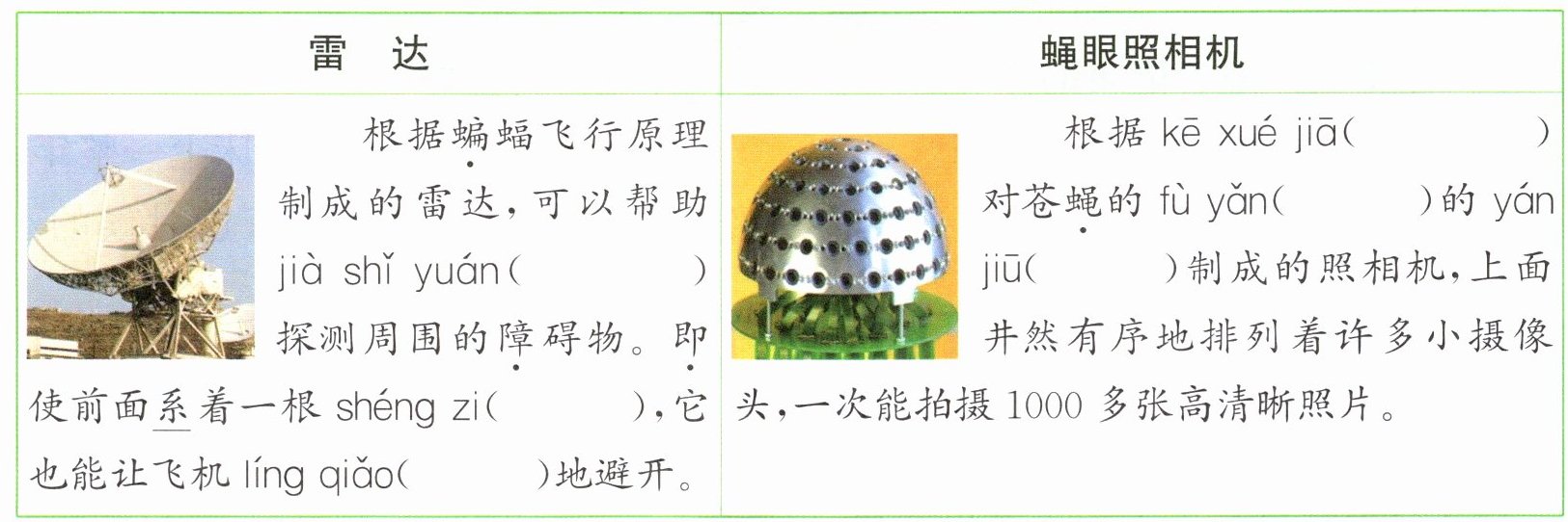|根据蝙蝠飞行原理制成的雷达,可以帮助jià shǐ yuán( )探测周围的障碍物。即使前面系着一根 shéng zi( ),它也能让飞机 líng qiǎo( )地避开。|根据 kē xué jiā( )对苍蝇的 fù yǎn( )的 yán jiū( )制成的照相机,上面井然有序地排列着许多小摄像头,一次能拍摄 1000 多张高清照片。|