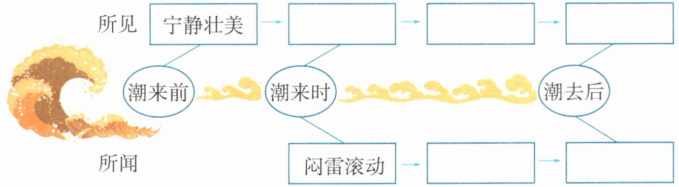 1. 新思维 逻辑梳理影片中呈现了钱塘江大潮由来到去的过程,请你根据课文内容帮阳阳填一填下面的思维导图。