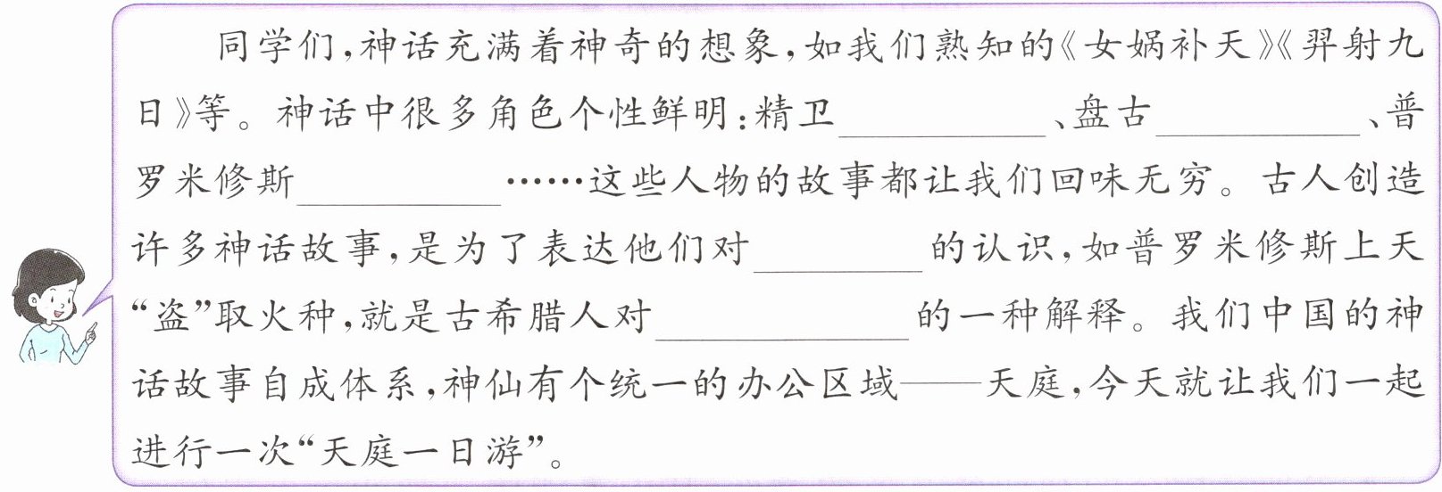 同学们,神话充满着神奇的想象,如我们熟知的《女娲补天》《羿射九日》等。神话中很多角色个性鲜明:精卫______、盘古______、普罗米修斯______……这些人物的故事都让我们回味无穷。古人创造许多神话故事,是为了表达他们对______的认识,如普罗米修斯上天“盗”取火种,就是古希腊人对______的一种解释。我们中国的神话故事自成体系,神仙有个统一的办公区域——天庭,今天就让我们一起进行一次“天庭一日游”。