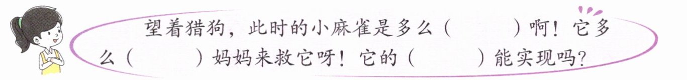 望着猎狗,此时的小麻雀是多么( )啊!它多么( )妈妈来救它呀!它的( )能实现吗?
