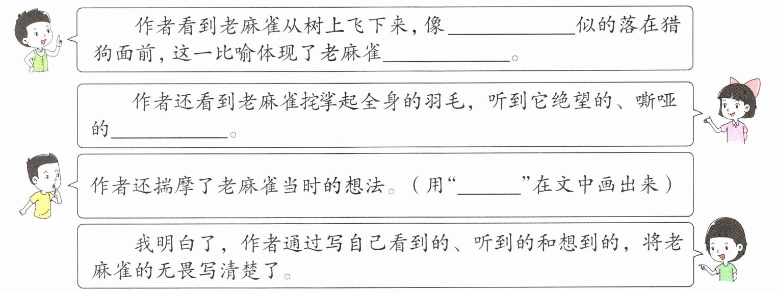 3. 作者是怎样把老麻雀的无畏写清楚的?几位同学对此展开了讨论,请将他们的发言补充完整。