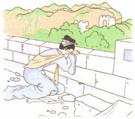 听到这个噩耗,孟姜女大哭起来。她整整哭了三天三夜,哭得天昏地暗,连天地都感动了。天越来越阴沉,风越来越猛烈,只听哗啦一声,一段长城被哭倒了,露出来的正是范喜良的尸首。