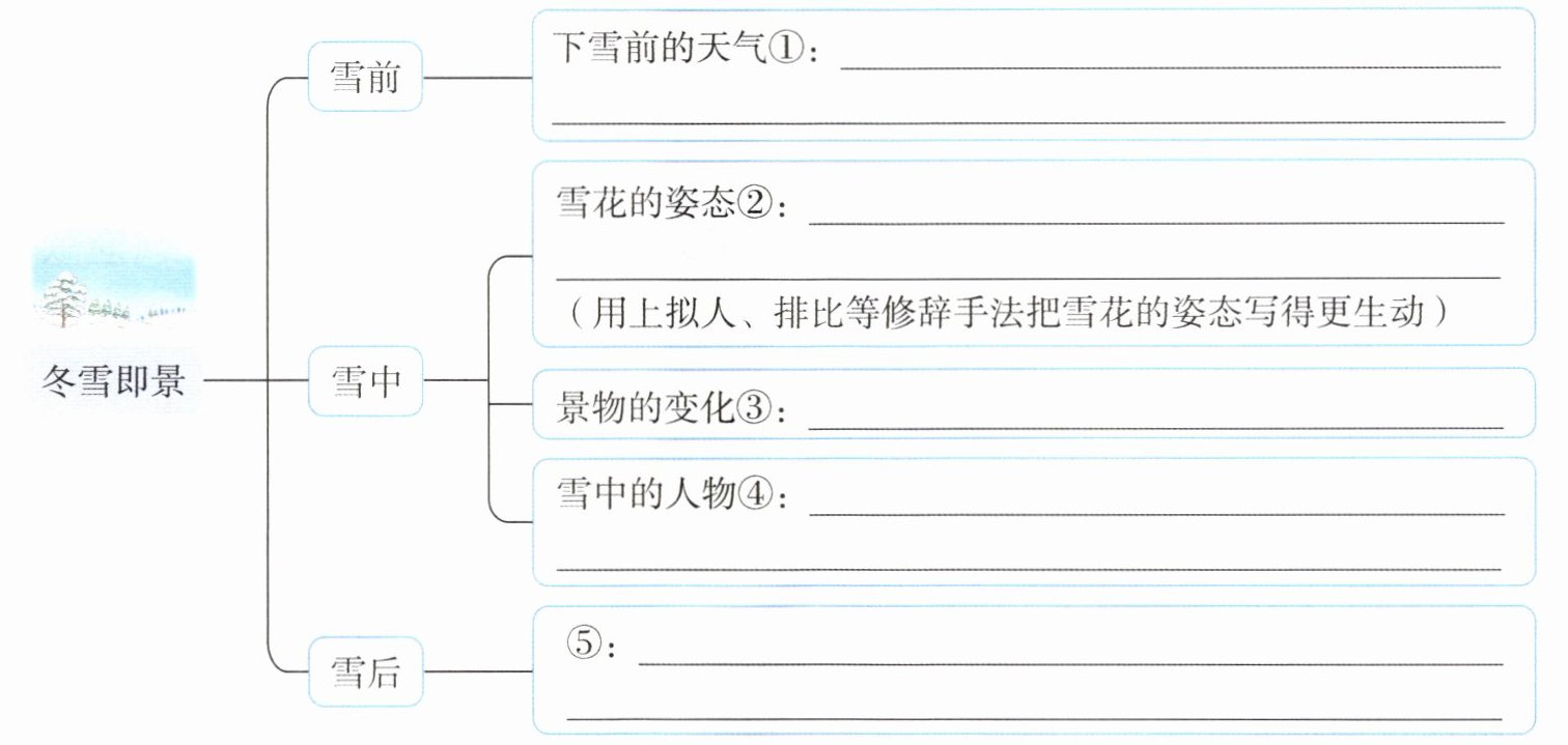 冬雪即景┌───┬─────────────────────────────┐│雪前│下雪前的天气①:天空阴沉沉的,淘气的北风好像在空中追逐嬉闹。│├───┼─────────────────────────────┤│ │雪花的姿态②:雪花像精灵般舞动着,或飞翔,或盘旋,或直直地快速坠落,铺落在地上。││ │(用上拟人、排比等修辞手法把雪花的姿态写得更生动)││雪中├─────────────────────────────┤│ │景物的变化③:马路边,白雪给树披上了白披风。││ ├─────────────────────────────┤│ │雪中的人物④:操场上,同学们有的在打雪仗,有的在滚雪球,还有的在堆雪人。│├───┼─────────────────────────────┤│雪后│⑤:雪后的世界安静极了,仿佛时间都停止了。我深深地吸了一口冰冷的空气,感受着这雪中的美好。│└───┴─────────────────────────────┘解析:本题考查理清写作思路的能力。根据思维导图给出的提示,结合生活中下雪的经历,完成填空即可。注意语句要通顺,用上恰当的修辞手法。我来写一写:忽然,起风了,原先静悄悄耷拉着的树叶微微晃动起来,一阵阵呼啸声响起——那是风吹过楼间发出的声音,风大起来了。紧接着,天空中的云朵开始迅速聚集,像被无形的力量驱赶着,翻滚、交织,天色渐渐暗淡下来。解析:本题考查语言表达的能力。依照给出的例子,选择其中一个技巧写一写一处正在变化的自然景物,要按照一定的顺序写出景物的变化并且灵活地运用动词,还可以从不同感官角度来写。