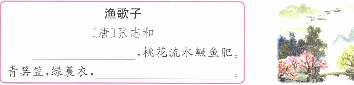 三 游湖途中,天上飘起细雨,阳阳不禁吟诵起张志和的《渔歌子》。请你阅读《渔歌子》并完成练习。