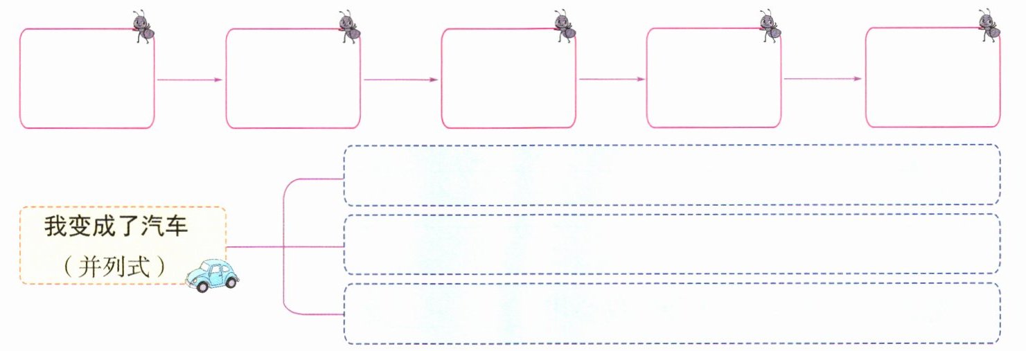 二【变形经历】示例:我和菜叶一起被扔进了筐子里。 饥饿的鸡鸭向我啄来。 我从鸭嘴下逃生。 我掉入了湍急的小溪。 我爬上了一片树叶。 每到周末,我就载着人们去不同的景区游玩。 我参加汽车比赛并获得了冠军。 冬天,小猫躲到我身下取暖。 解析:本题考查理清写作思路的能力。《小蚂蚁历险记》要设计的故事情节是递进式的,即前后的故事情节之间有联系,环环相扣;《我变成了汽车》要设计的故事情节是并列式的,即每个情节之间几乎没有关联。 三【变形练习】我变成了小雨滴 我变成小雨滴后,风婆婆把我和我的伙伴们一起吹到了一片干涸的池塘上空。池塘里的鱼儿在痛苦地挣扎着,小虾几乎喘不过气来。 大家看到这个场景后都奋不顾身地往下跳,可我却犹豫不决。虽然我身边的小伙伴都在往下跳,可我还是不敢,我怕落到干涸的池塘里会很疼。这时,速度极快的闪电哥哥吼叫起来,他鼓励我勇敢地跳下去。披着黑袍的乌云姐姐对我说:“雨滴妹妹,跳吧!他们需要你!” 受到鼓舞后,我的心里充满了力量。于是,我和一个小伙伴手拉手,纵身跳入了池塘。 解析:本题考查语言表达的能力。联系上下文并结合提示,展开想象,补充这篇习作,注意用上拟人的修辞手法丰富描写。