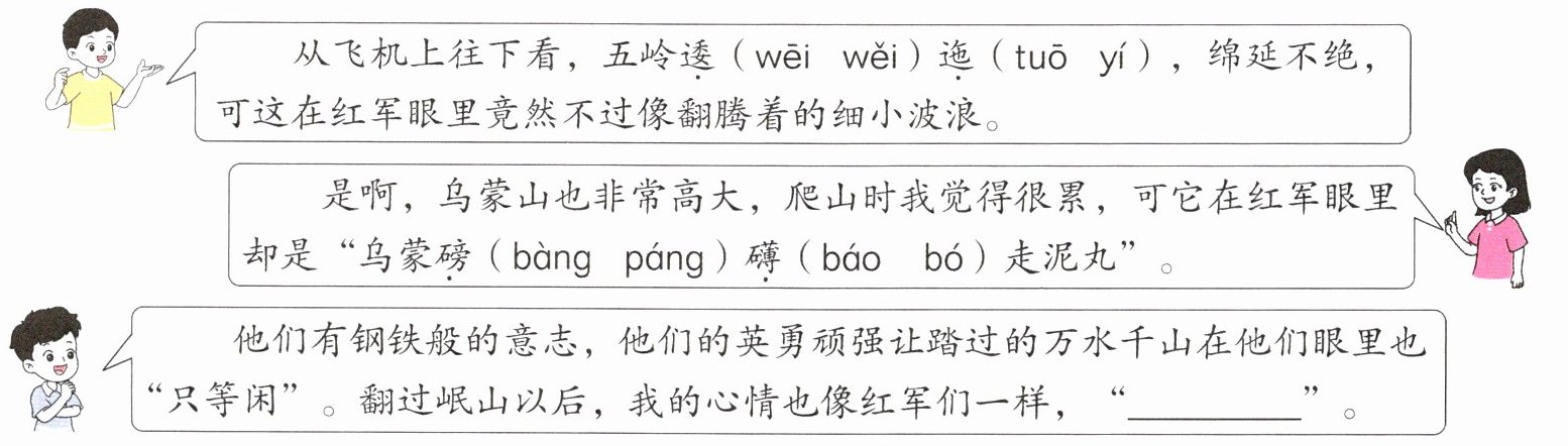 (báo bó)走泥丸”。他们有钢铁般的意志,他们的英勇顽强让踏过的万水千山在他们眼里也“只等闲”。翻过岷山以后,我的心情也像红军们一样,“______”。