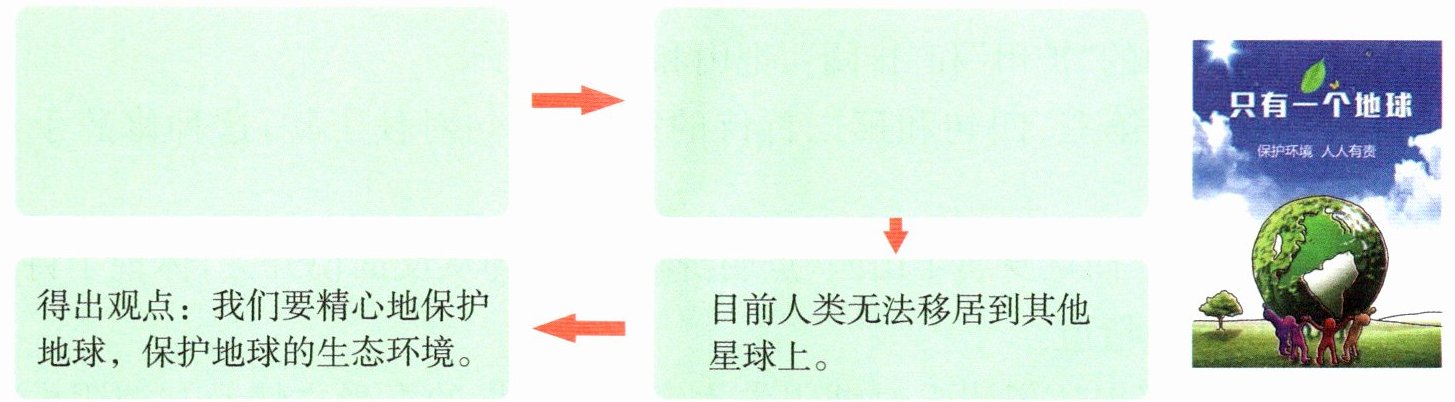 1. 看到这幅海报,阳阳想起了《只有一个地球》一文,作者是如何一步步证明自己观点的?根据课文内容把下面的导图补充完整。