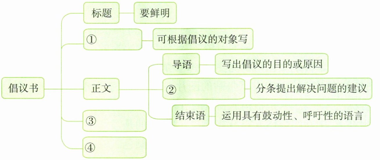 ①称呼 ②倡议的内容 ③署名 ④日期 解析:本题考查对倡议书格式的了解。倡议书分为五部分:标题、称呼、正文、署名、日期。标题要鲜明,点明倡议的主题。称呼要根据倡议的对象来写,一般在标题下方顶格处。正文分为三部分:一是倡议的目的或原因,要求写清楚现状及问题;二是建议,要求把解决问题的建议分条提出;三是结束语,运用具有鼓动性、呼吁性的语言,增强感染力。最后在右下角加上署名和日期。