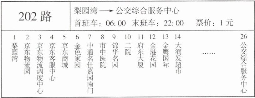 1. 22:00 2. 2 3. 示例:你要乘坐 202 路公交车,在锦华名园站上车,坐 5 站,到大润发超市站下车。解析:本题考查对公交站牌的了解。第 1题,根据站牌图片可知,末班车出发时间为22:00;第 2题,从金色家园到市中医院需要坐 2 站;第 3 题,康康的朋友住在锦华名园,要去大润发超市,所以他要在锦华名园站上车,坐 5 站,到大润发超市站下车。