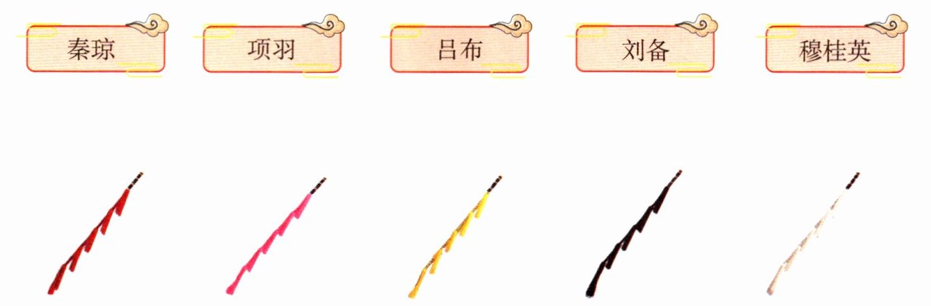 四 新趋势 传统文化【趣谈马鞭种类】京剧中,马鞭的颜色一般表示马的颜色。猜一猜下列人物分别会使用哪种颜色的马鞭,连一连。