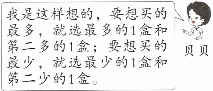 我是这样想的,要想买的最多,就选最多的1盒和第二多的1盒;要想买的最少,就选最少的1盒和第二少的1盒。