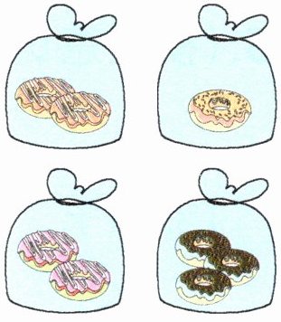 2. 到了糕点区,果果饿了,她还想买2袋不同口味的甜甜圈,她最多可以买( )个,最少可以买( )个。