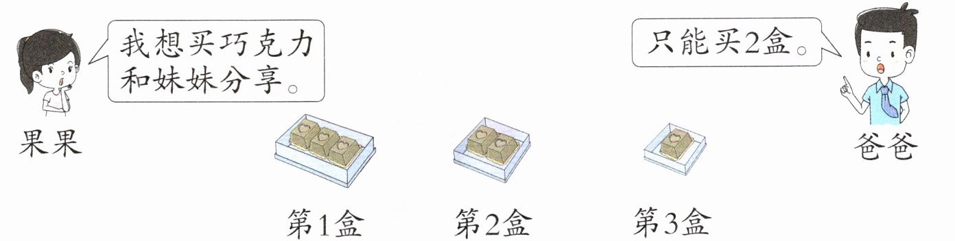 1. 星期日,果果去逛超市。走到糖果区,她想从下面3盒巧克力中买2盒,你能帮她算一算,她最多能买几块?最少能买几块吗?