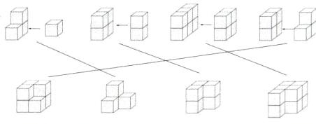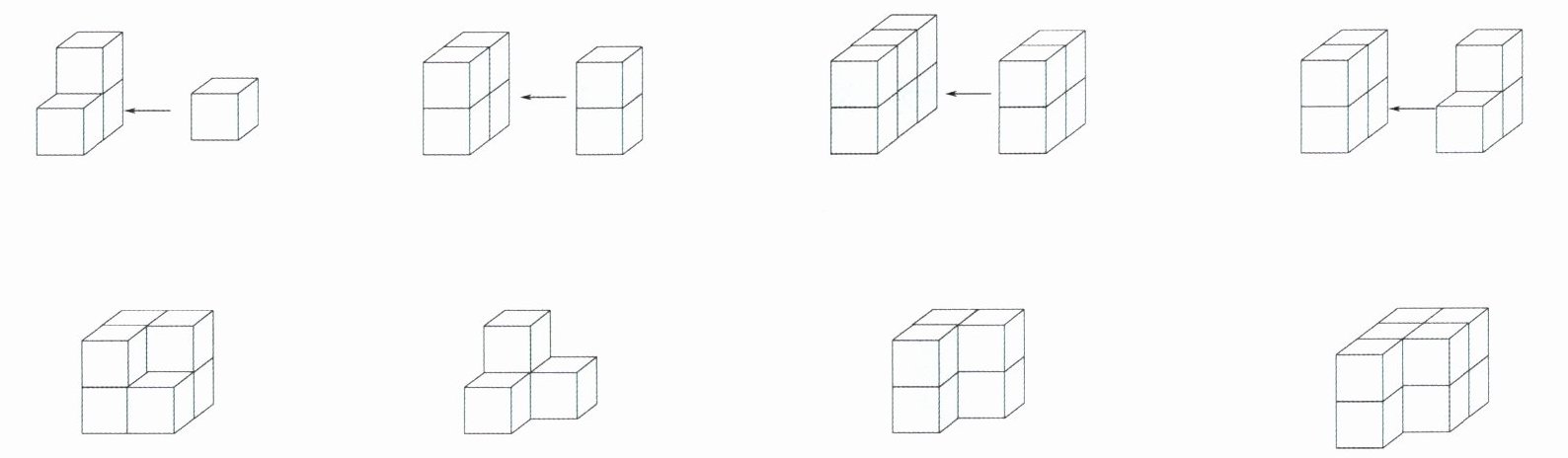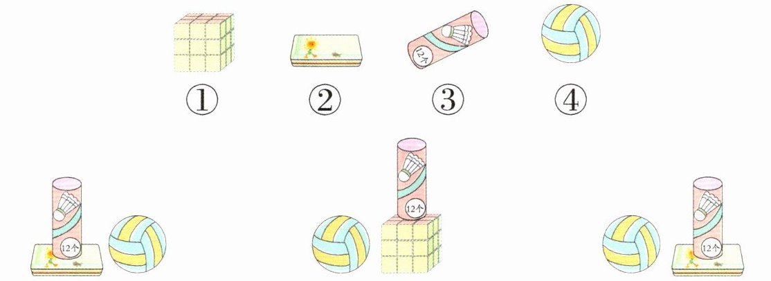 3. 亮亮在做拼搭,他拿了②号物品,在它上面放了③号物品,又在它们的左边放了④号物品,下面哪种形状是他拼搭的?请你圈一圈。