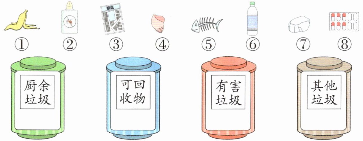 4.(生活应用)把下面的垃圾丢在合适的垃圾桶中。(填序号)