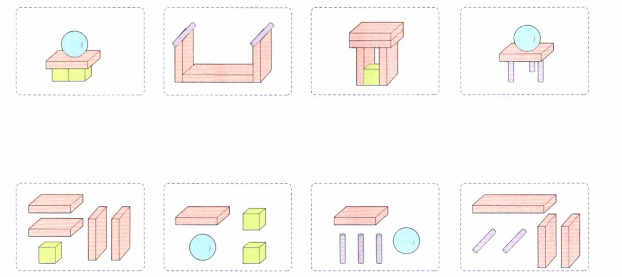 (2)先摆一个圆柱,然后在圆柱的上面摆一个正方体,左边摆一个球,右边摆一个长方体。